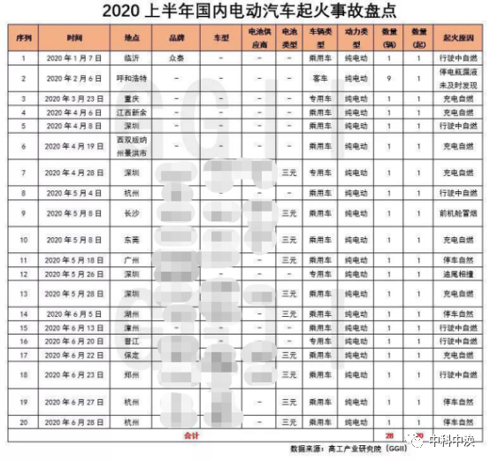 高工產(chǎn)業(yè)研究院(GGII)根據公開(kāi)報道不完全統計,2020上半年國內共發(fā)生電動(dòng)汽車(chē)起火事故20起,較去年同期下降31%;涉及車(chē)輛數目28輛,較去年同期下降22%,雖然國內電動(dòng)汽車(chē)起火事故跟去年同期相比有所下降,但行業(yè)安全問(wèn)題仍不容忽視。
