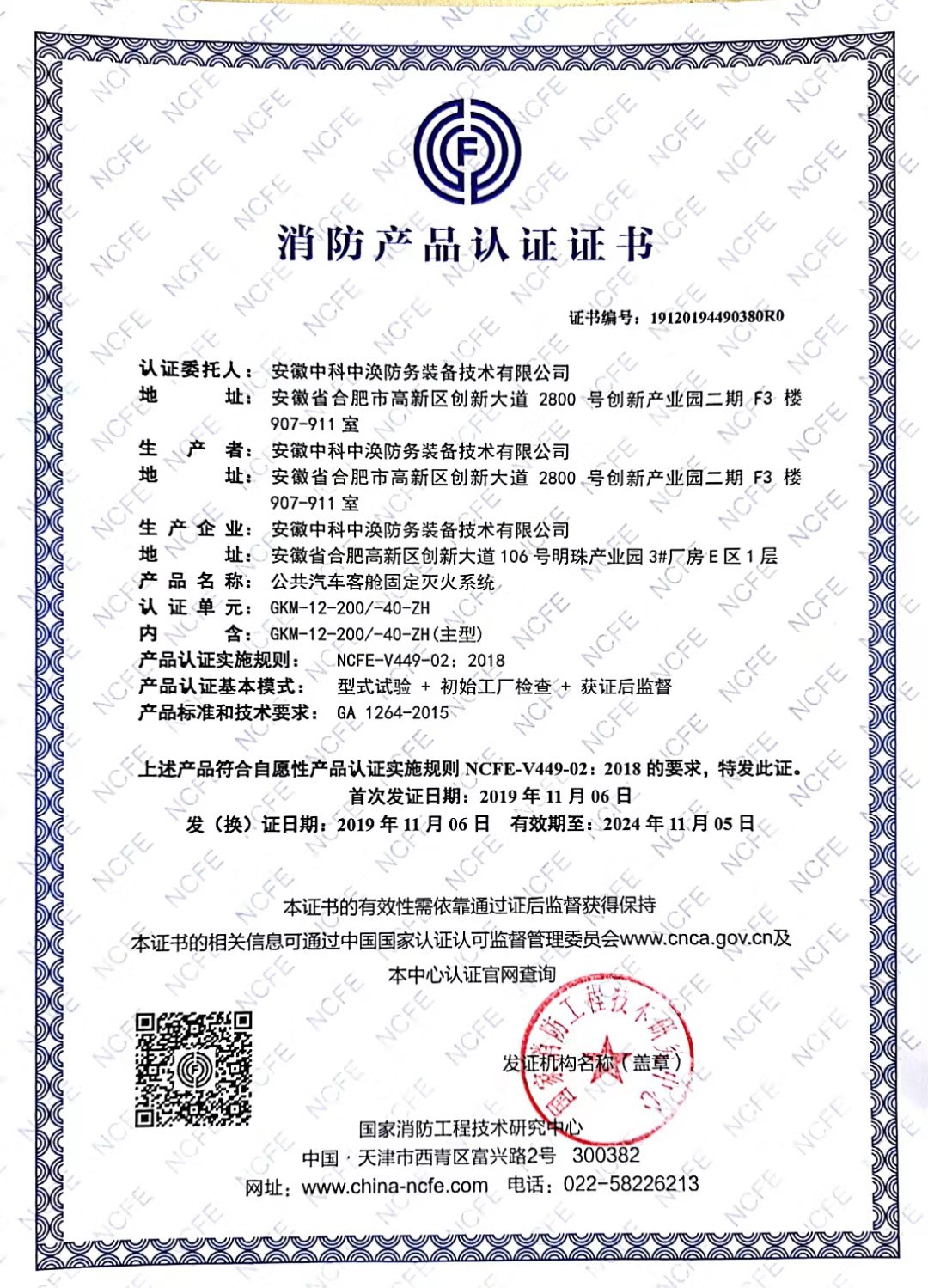 在2019年接近尾聲之際,中科中渙自主研發(fā)的公共汽車(chē)客艙固定滅火系統通過(guò)了國家消防工程技術(shù)研究中心的檢驗,順利取得消防產(chǎn)品認證證書(shū)(證書(shū)編號:19120194490380R0),成為該行業(yè)內為數不多取得此項認證證書(shū)的企業(yè)之一。