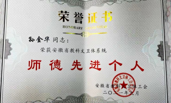 根據安徽省教科文衛體工會(huì )印發(fā)的《關(guān)于選樹(shù)安徽省教科文衛體系統職業(yè)道德先進(jìn)個(gè)人的通報》(皖教科文衛體工〔2021〕39號),中科大火災科學(xué)國家重點(diǎn)實(shí)驗室孫金華教授榮獲安徽省教科文衛系統“師德先進(jìn)個(gè)人”榮譽(yù)稱(chēng)號。