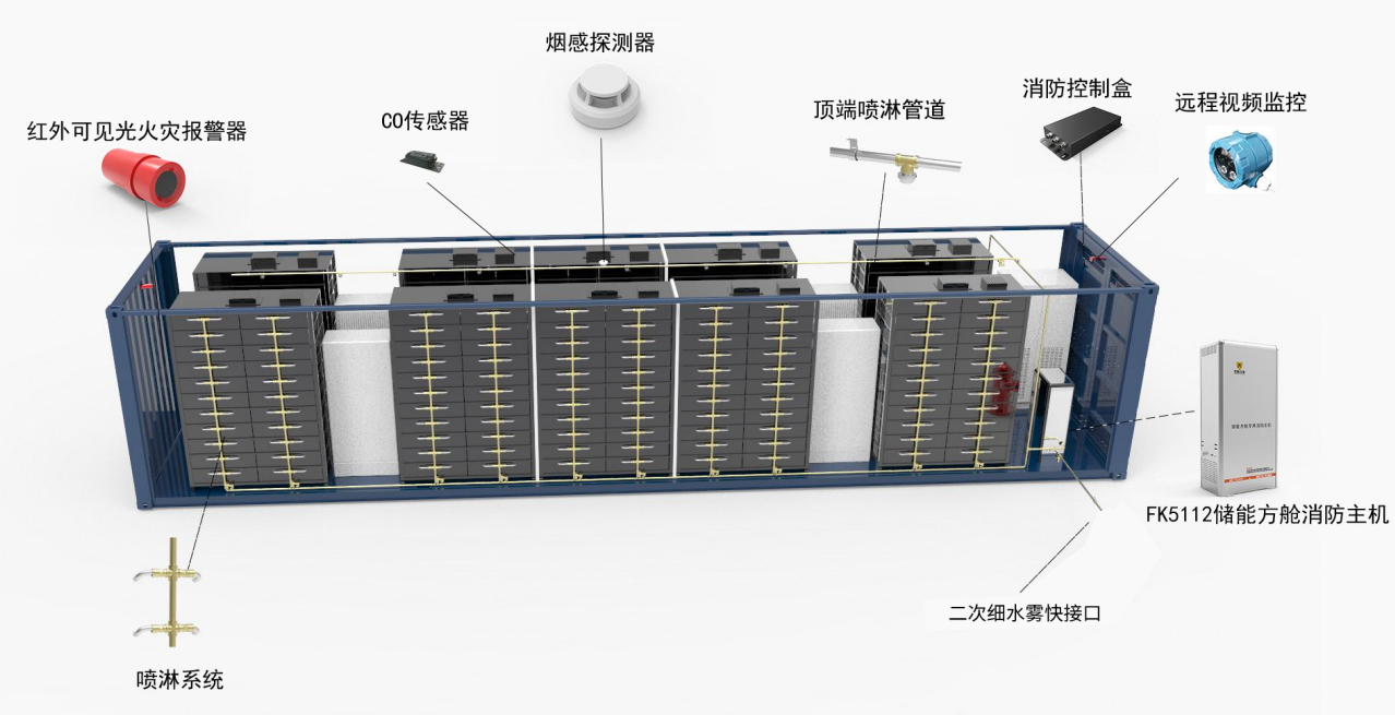 中科久安與火災科學(xué)國家重點(diǎn)實(shí)驗室共建聯(lián)合實(shí)驗基地,針對行業(yè)痛點(diǎn),自主研發(fā)的程控式“ 電化學(xué)儲能系統熱失控監測預警及防護系統”,可運用通過(guò)多參數耦合探測技術(shù)(溫度、煙霧、特征氣體、火焰等)與鋰離子電池熱失控預測模型的有機結合,實(shí)現對電池火災的精準判斷和多級預警。消防方面運用滅火效率高、絕緣性能好、環(huán)保潔凈的全氟己酮滅火劑,其獨特的點(diǎn)動(dòng)噴射技術(shù)可實(shí)現對熱失控電池的快速撲救和長(cháng)效抑制。該系統利用同一管路及噴組,兼容二次水消防,可實(shí)現對電化學(xué)儲能電站火災的多級防護,大幅提升電化學(xué)儲能行業(yè)的安全防護能力。