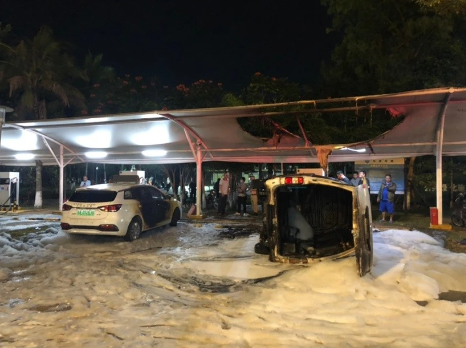 2022年2月20日,廣西柳州市柳南區飛鵝路附近一地下車(chē)庫的國聯(lián)出租汽車(chē)綜合服務(wù)站內,一輛停放在充電位上的新能源出租車(chē)突然冒出濃煙,隨后起火燃燒。