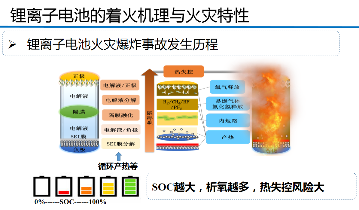 通過(guò)化學(xué)方面的研究發(fā)現,發(fā)生化學(xué)反應需要達到八九十度,電池系統正常的使用溫度是常溫,在電池使用過(guò)程中,無(wú)論單個(gè)電池,還是電池系統,都會(huì )在充放電過(guò)程中放熱,熱量如果不及時(shí)導出,會(huì )使電池系統溫度升高到發(fā)生化學(xué)反應的臨界溫度,從而誘發(fā)化學(xué)反應。我們把鋰離子電池發(fā)生火災甚至爆炸事故的歷程以及跟溫度的關(guān)系做了這個(gè)圖,首先是循環(huán)產(chǎn)熱,這是物理的熱量,從而誘發(fā)化學(xué)反應。
