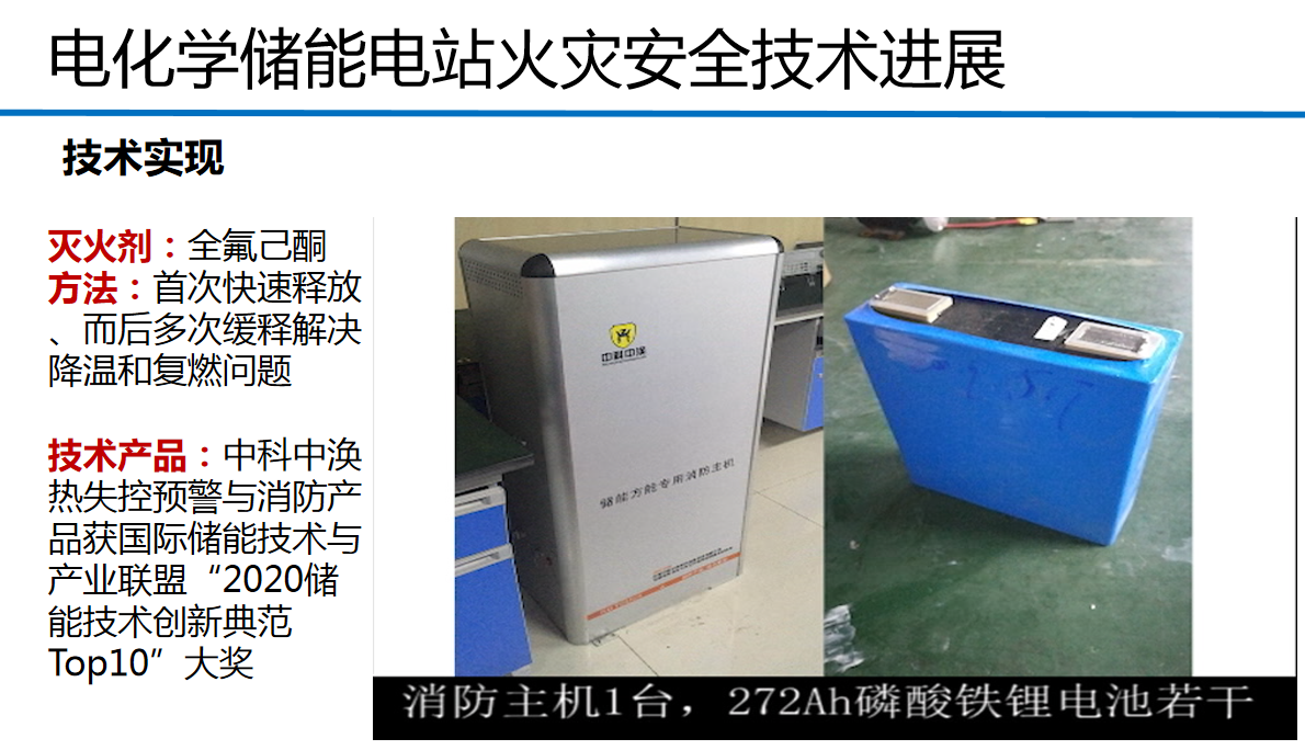 3、快速精準滅火與抗復燃技術(shù)。團隊對不同的滅火藥劑,例如水、七氟丙烷、二氧化碳、氣溶膠等這些滅火藥劑進(jìn)行了系統的試驗,從這些滅火的試驗來(lái)看,七氟丙烷滅火效果較好,二氧化碳稍弱。如果電池模組使用水系滅火,要防止產(chǎn)生短路,對滅火器要求快速滅火、高效冷卻,而且冷卻、絕緣。對滅火技術(shù)要求防止復燃,兼具多次滅火的功能。為此,在這里主要是通過(guò)滅火劑來(lái)實(shí)現,我們推薦全氟己酮,方法是首次快速釋放,而后多次緩釋解決降溫和復燃問(wèn)題。這個(gè)技術(shù)在中科中渙得到了產(chǎn)業(yè)化,在今年得到了2020儲能技術(shù)創(chuàng )新典范TOP10的大獎。