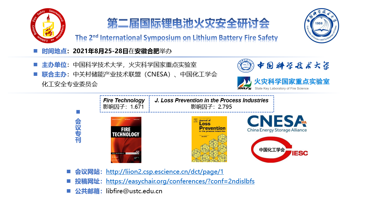 預告:2021年8月25日至28日,在合肥將要舉辦第二屆國際鋰離子電池的安全研討會(huì ),第一屆是去年在合肥成功舉辦,參會(huì )人員接近三百人,包括十幾個(gè)國家和地區,同時(shí)與一些著(zhù)名的火災安全方面的期刊合作,把優(yōu)秀的論文進(jìn)行發(fā)表。