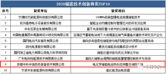 【中科中渙】榮獲“2020儲能技術(shù)創(chuàng )新典范TOP10”大獎